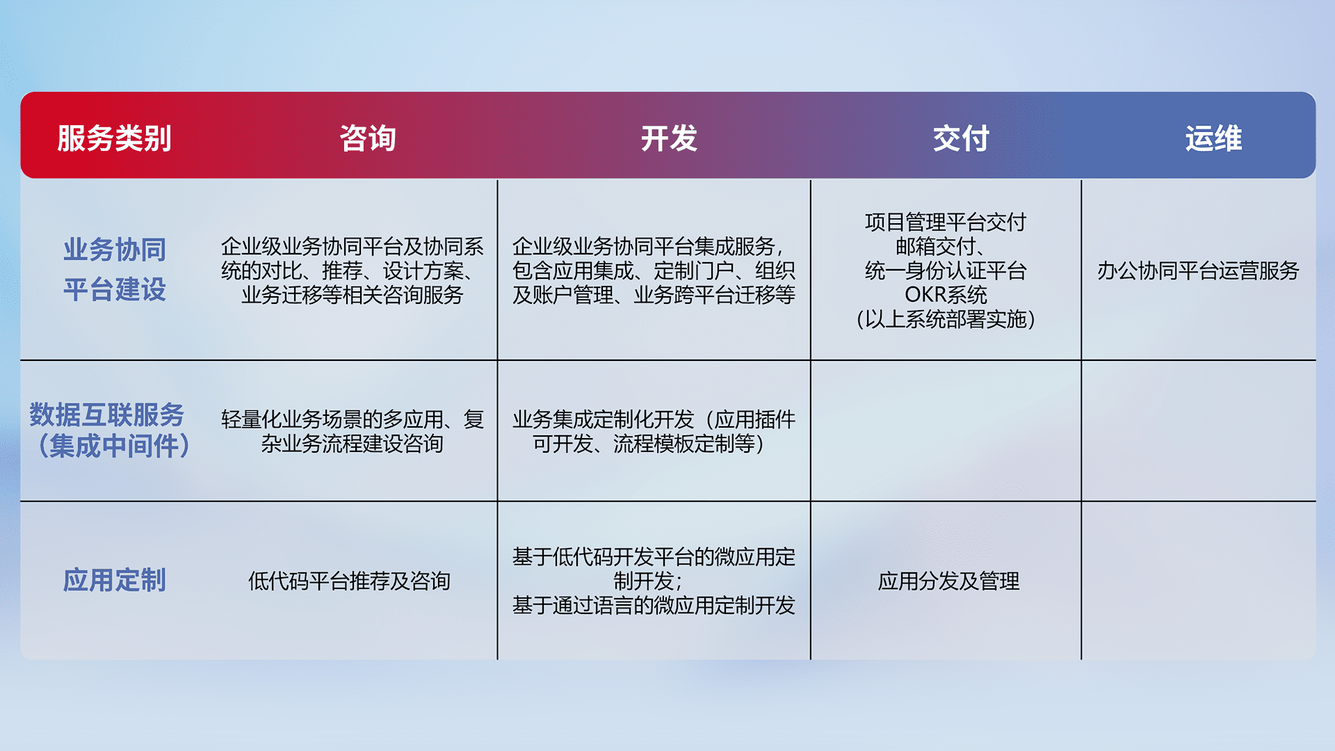 针对钉钉、、、企微、、IDaas等平台级产品提供产品的规划、、、方案、、、、交付、、、、定制化开发等服务,,实现如统一协同办公、、、、智能客户服务、、混合会议管理、、、、智能数据查询、、、等业务场景,,实现数字化转型。。。